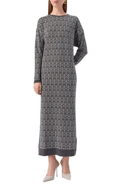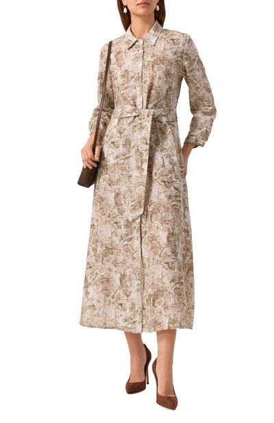 Коричневое платье-рубашка с леопардовым принтом сшито из гладкого дышащего хлопка с добавлением прочных шелковых нитей, придающих ткани деликатный блеск. Модель с длинными рукавами, отложным воротником и высокими разрезами по бокам дополнена узким съемным поясом-лентой. Предлагаем завершить образ сандалиями и сумкой черного цвета.