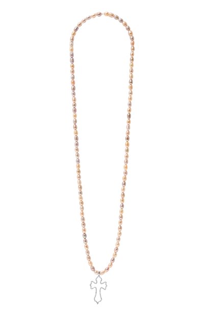 Длинное золотисто-бежевое колье собрали из речных жемчужин уникальной неправильной формы. Аксессуар дополнили крупным фигурным крестом из серебра 925-й пробы. Ажурную подвеску украсили паве из миниатюрных прозрачных фианитов.