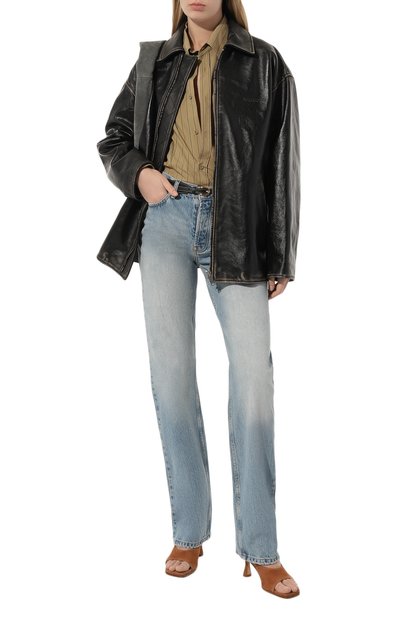 Прямым голубым джинсам добавили блестящий акцент, украсив их спереди россыпью сверкающих миниатюрных стразов. Для пошива модели с высокой посадкой использовали прочный неэластичный деним, который долго не потеряет форму. Выбеленное изделие с искусственными небольшими потертостями декорировали на поясе сзади бежевым патчем с логотипом.