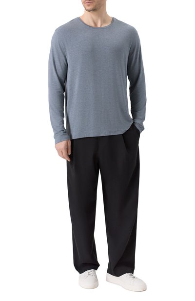 Лонгслив насыщенного голубого цвета сшили из тонкого гладкого джерси. Для его изготовления использовали премиальный хлопок с длинными шелковистыми волокнами, поэтому материал получился мягким и дышащим. В таком изделии будет комфортно во время сна и отдыха.