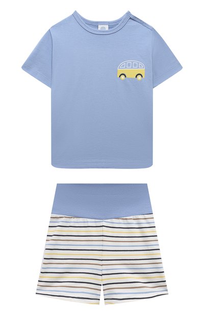 Для пошива пижамы использовали трикотаж из органического хлопка, сертифицированного по экологическому стандарту OEKO-TEX®. Безопасный для малыша материал не раздражает кожу и хорошо пропускает воздух, поддерживая оптимальный микроклимат. Чтобы футболку с ярким принтом было проще надевать и снимать, в плечевом шве разместили планку с потайными кнопками. Полосатые шорты дополнили широким эластичным поясом в тон верху.