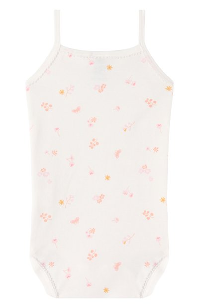 Кремовое боди с узкими бретелями выполнили из нежного хлопкового трикотажа с пастельным принтом в виде бабочек. Материал из длинноволокнистого органического сырья безопасен для детской кожи и хорошо пропускает воздух. На шаговом шве предусмотрели миниатюрные плоские кнопки.