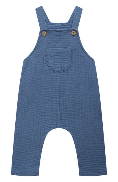 Синий комбинезон обеспечит ребенку комфорт в теплую погоду. Изделие с одним нагрудным карманом сшили из фактурного хлопкового муслина, эффективно пропускающего воздух. Легкий материал выполнили из органического сырья, при выращивании которого отказались от пестицидов. Сзади модель украсили нашивкой с надписью One Earth, One Family, One Planet.