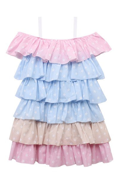 Для пошива платья кремового оттенка использовали мягкую хлопковую ткань, не препятствующую циркуляции воздуха. Многоярусный расклешенный подол украсили ажурной вышивкой с цветочным мотивом, выполненной в технике ришелье. Модель с круглым вырезом и рукавами-фонариками застегивается потайными пуговицами спереди.