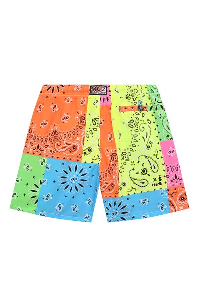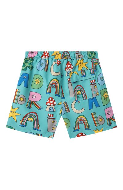 Разноцветные плавки-шорты с ярким принтом, словно нарисованным детской рукой, сшили из шелков истого полиэстера. Для производства материала использовали переработанные полимерные отходы, что помогло сократить вредные выбросы и расход ресурсов. За удобную посадку на талии отвечает брендированный полосатый пояс-резинка. Модель дополнили боковыми прорезными и накладным задним карманом, застегивающимся клапаном с лентой велкро.