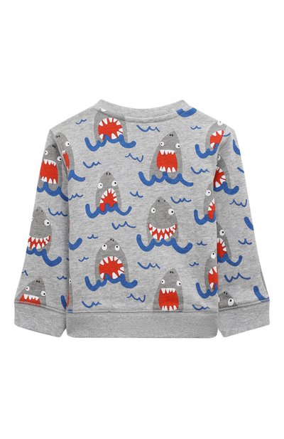 Для пошива свитшота использовали джерси на основе органического хлопка. Модель украсили сплошным принтом в виде акул, оставив пояс, горловину и манжеты однотонными.