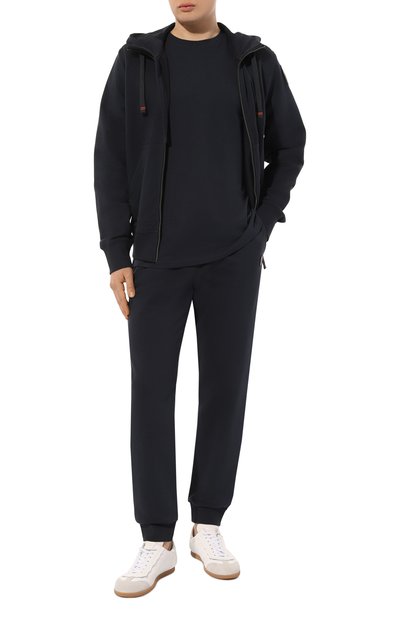 Темно-синие джоггеры станут комфортной основой непринужденного повседневного образа. На удобство работает мягкий трикотаж на основе хлопка, который обеспечивает оптимальную терморегуляцию и слегка тянется, не ограничивая свободу движений. Модель дополнена поясом-кулиской, регулирующим посадку по фигуре, и четыр ьмя карманами: открытыми боковыми и задними, застегивающимися на молнию.
