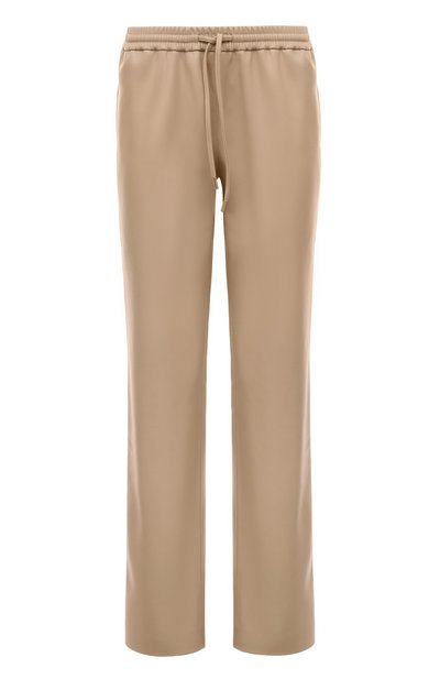 Бежевые брюки прямого кроя станут удачной инвестицией в базовый гардероб. Лаконичную модель с двумя боковыми карманами делает выразительной материал: для ее пошива использовали мягкую мелкозернистую экокожу с приятной на ощупь изнанкой. За комфортную посадку изделия по фигуре отвечает эластичный пояс-кулиска.