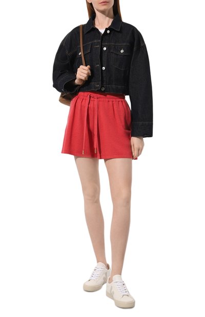 Для изготовления свободных розовых шортов с высокой линией талии использовали мягкий вискозный трикотаж с жаккардовым цветочным узором в тон. Чтобы укрепить материал, в его состав включили полиэстер. Модель с небольшими защипами спереди и фестончатыми краями дополнили эластичным поясом.