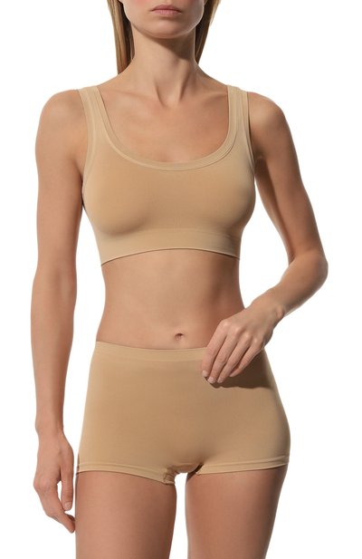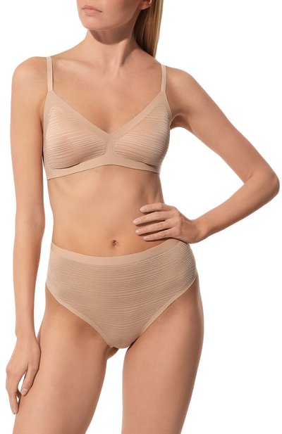 Бежевые слипы с высокой посадкой выполнены из тонкого гладкого джерси с шелковистой текстурой. Приятный на ощупь матовый материал отлично пропускает воздух, а плоские швы не раздражают к ожу. Однотонные трусы с узкой резинкой не будут заметны под облегающей одеждой.