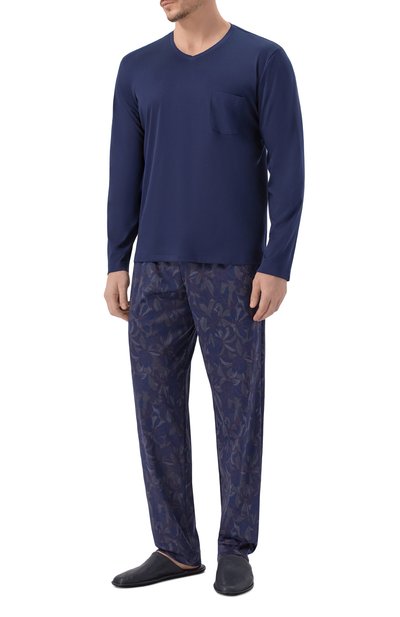 Темно-синюю пижаму из линии Natural Comfort сшили из легкого интерлока, произведенного из шелковистого лиоцелла. Тонкий материал хорошо пропускает воздух и отводит влагу, поддерживая правильную терморегуляцию. Роль акцента отдали белому канту, которым выделили края брюк с эластичным поясом и рубашки с пуговицами из переработанного сырья.