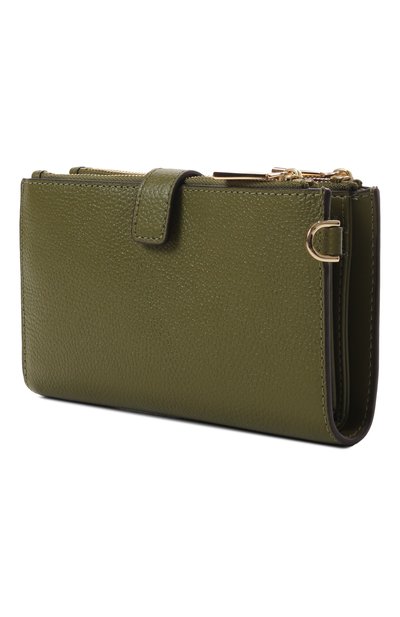 Портмоне Camelia с логотипом и эмблемой Arch спереди сшито из тисненой кожи. Внутри аксессуара, закрывающегося ремешком с кнопкой, разместили отделение для купюр, карман для монет, пять карточных слотов и боковые отсеки.