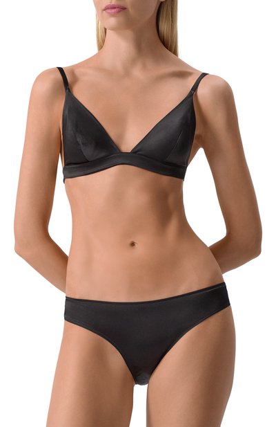 Черный бюстгальтер с V-образным вырезом останется незаметным под нарядом с глубоким декольте. Для пошива модели использовали гладкий эластичный атлас на основе нежного шелка. Посадку можно регулировать широким поясом и бретелями, которые раздваиваются сзади. Модель с плотными чашечками на косточках обеспечивает оптимальную поддержку груди.