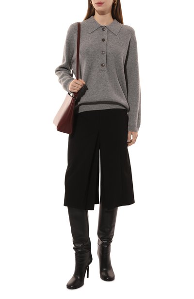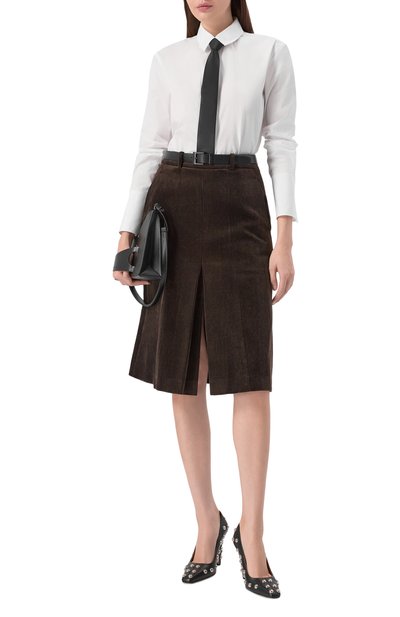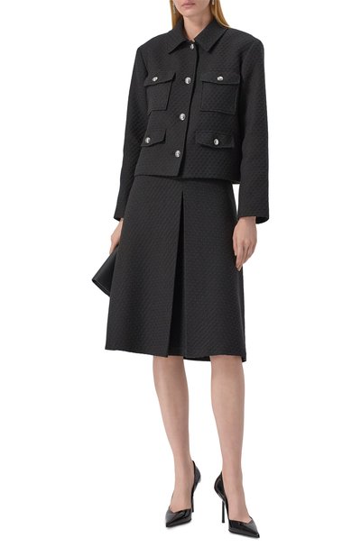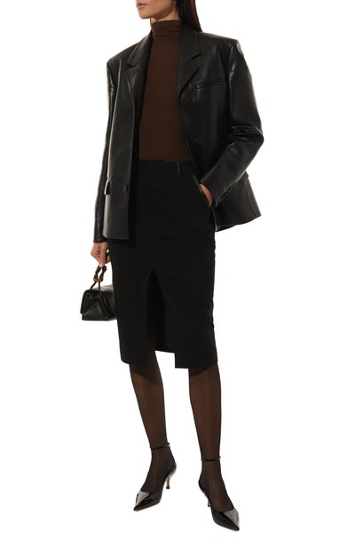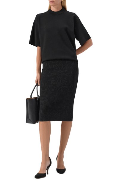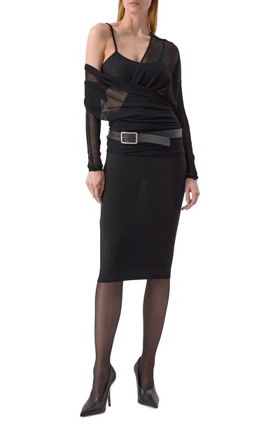 Строгость черной юбки-карандаш длиной до колен снижает высокий разрез спереди, открывающий ноги. Для пошива модели с широким поясом использовали тонкую шелковистую шерсть. Материал не требует особенного ухода: чтобы разладить мелкие складки, достаточно слегка увлажнить вещь.