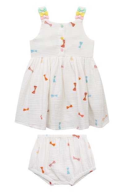 Платье из хлопкового муслина с мелкой сетчатой фактурой отлично пропускает воздух, быстро впитывает и испаряет влагу, поэтому поможет поладить с летней жарой. На гипоаллергенном текстиле из органического сырья вышили разноцветные банты и зарифмовали с ними аппликацию из ленты грогрен на бретеля х с пуговицами. Легкую модель дополнили шортами из такого же материала.