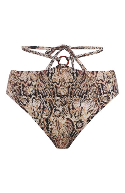Разноцветные плавки-бикини с классической посадкой дополнены кольцом и шнурами, создающими акцент на талии. Эластичная модель сшита из мягкой матовой лайкры с принтом под питона. Приятный на ощупь материал хорошо пропускает воздух и быстро высыхает после купания, а тщательно обработанные швы не раздражают кожу.