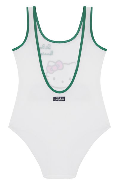 Белоснежный слитный купальник с открытой спиной и широкими бретелями изготовили из шелковистой эластичной микрофибры. Приятный на ощупь материал быстро сохнет, легко тянется и не деформируется под воздействием соленой и хлорирован ной воды. Роль декора играет черный логотип спереди.