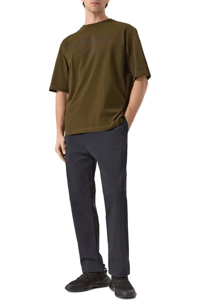 Повседневные брюки цвета хаки гарантируют комфорт благодаря прямому крою, эластичному поясу с внутренней кулиской и дышащему трикотажу стрейч с мелкой «вафельной» фактурой. Волокна хлопка в материале переплетены с модалом, который придает модели особую мягкость и одновременно делает ее более прочной. Врезные боковые и задний карманы застегиваются молнией с пуллером в форме литеры B.