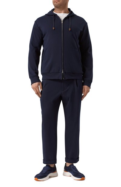 Темно-синее худи из микса хлопка и полиэстера только кажется предельно лаконичным. Вблизи на плотном материале становится заметной рельефная диагональная полоска. Мелкой фактуре противопоставлены эластичные гладкие вставки на спинке и на рукавах, один из которых украшен вышитой литерой B. Врезные боковые карманы застегиваются молнией, как и сама модель прямого кроя.