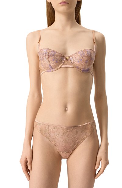 Бюстгальтер-балконет Magnetic Spell с мягкими чашечками на косточках изготовили из эластичного тюля с французской цветочной вышивкой. Вырез на поясе модели с регулируемыми бретелями украсили фирменной подвеской.