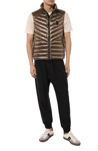 Жилет оттенка хаки сшили из шелковистого рипстопа, сотканного из прочного переработанного нейлона. Легкий материал отталкивает капли влаги, не пропускает ветер и быстро сохнет. Модель с тремя карманами и регулируемым капюшоном утеплили отборным утиным пухом, равномерно распределенным по горизонтальным стеганым камерам.