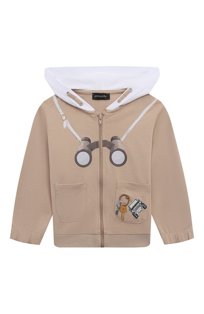 Для пошива бежевой толстовки с белым капюшоном использовали мягкий хлопковый трикотаж с добавлением эластана. Модель дополнили двумя небольшими накладными карманами, один из которых украсили вышивкой, изображающей ключи и брелок в форме автомобиля. Мотив поддерживает принт в виде бинокля.