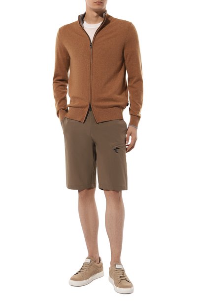 Для пошива лаконичных шортов оттенка хаки использовали тонкий дышащий хлопок с добавлением эластана для лучшей посадки по фигуре. Модель дополнили пятью прорезными карманами, один из которых деликатно подчеркнули миниатюрной фирменной заклепкой. Наши стилисты включили изделие в непринужденный летний образ с белой футболкой, полосатой голубой рубашкой и минималистичными кедами.