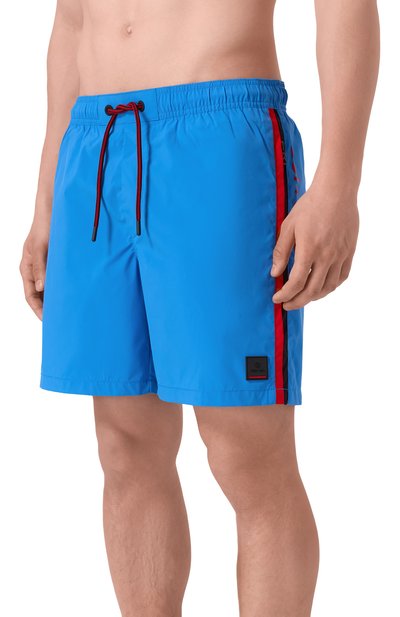 Для пошива плавок-шортов с боковым карманом на молнии использовали гладкий полиэстер. Чтобы мокрый текстиль не прилипал к ногам, предусмотрели невесомую сетчатую подкладку. Отрегулировать посадку на талии позволяет эластичный пояс-кулиска с контрастным полосатым шнуром. В тон последнему выполнили узкие лампасы, логотип и полосу на фирменном резиновом патче слева.
