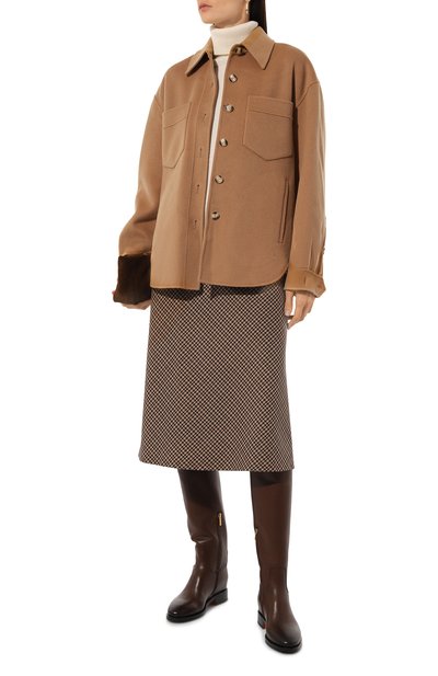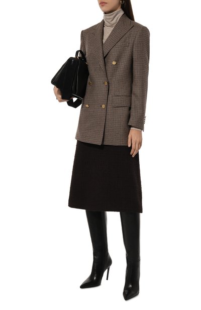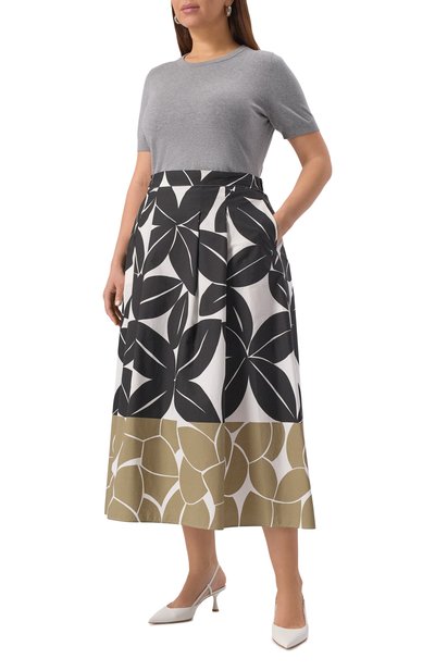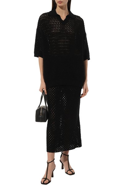 Миди-юбку прямого кроя связали в технике кроше из плотной хлопковой пряжи в оттенках синего и коричневого, черного и белого. Контрастные нити сформировали акцентный ажурный узор в виде концентрических квадратов, которые превращаются вверху и внизу в полоску. Однотонный эластичный пояс дополняет рисунок.