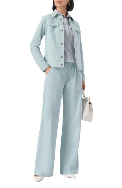 Для пошива голубых расклешенных брюк использовали мелкозернистую кожу с легким блеском. Материал выделали вручную, сделав его особенно мягким и пластичным, поэтому модель садится идеально по фигуре. Широкий эластичный пояс удобно облегает талию. Спереди сформировали графичную кокетку, словно позаимствованную у ковбойской одежды.