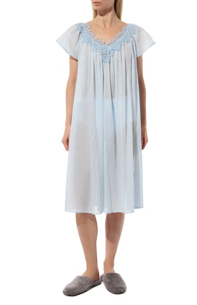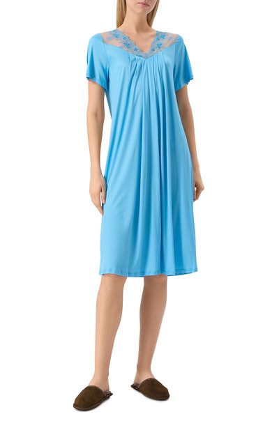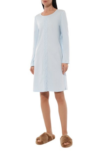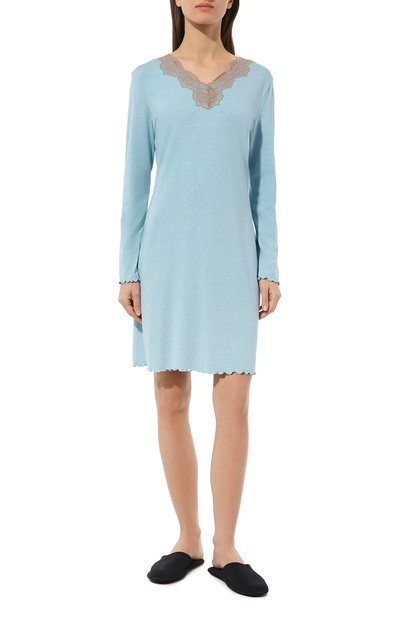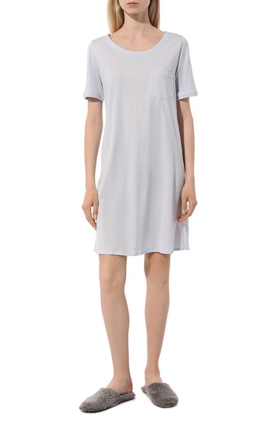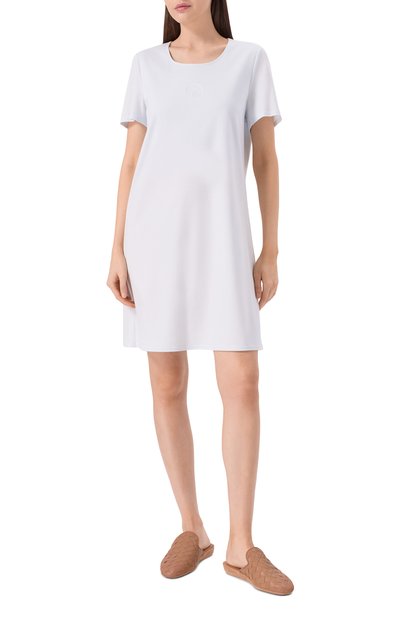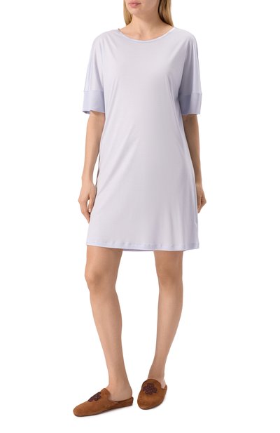 Сорочку с разрезами по бокам выполнили из меланжевого трикотажа на основе модала. Спереди модель украсили вырезанной лазером эмблемой из тюля и атласа.