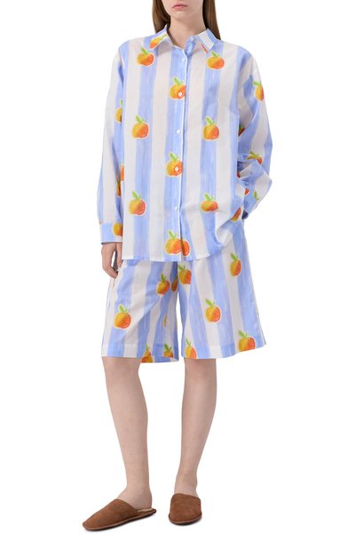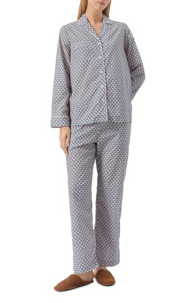 Меланжевую пижаму сшили из эластичного модала. В комплект включили футболку с боковыми разрезами и эмблемой марки и широкими брюками с поясом на резинке.