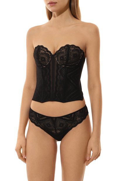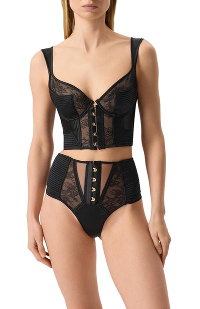 Корсет с фигурным вырезом и эластичной шнуровкой на спинке застегивается потайной молнией сбоку. Модель с ребрами жесткости выполнили из стрейчевого шелкового атласа.