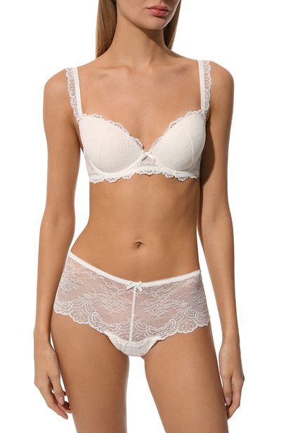 Для пошива белых трусов-шортов использовали нежное эластичное кружево с цветочными мотивами. Белье из такого тонкого и при этом прочного материала практически не ощущается на теле и не выделяется под облегающей одеждой. Узкий фестончатый пояс украшен миниатюрным золотистым шармом, инкрустированным прозрачным кристаллом Swarovski.