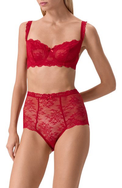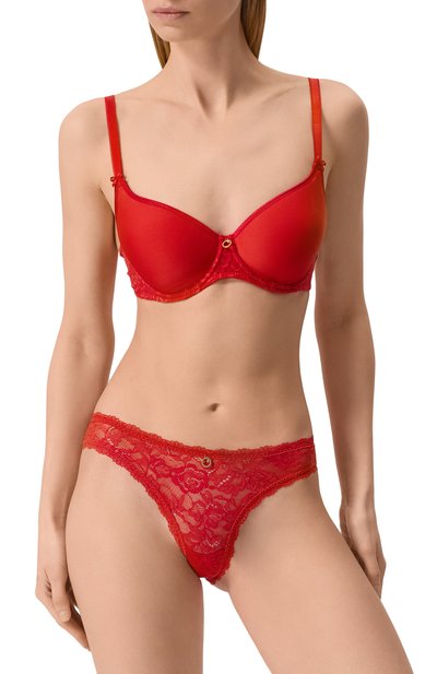 Бюстгальтер-балконет Rosessence с плотными чашечками сшили из тонкого кружева с цветочным мотивом. Модель с треугольными вставками на спинке украсили спереди миниатюрными бантами и фирменной подвеской с кристаллом Swarovski. Посадку изделия можно регулировать слайдерами на бретелях и двумя крючками на поясе с тремя вариантами объема.