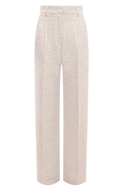 Бежевые брюки с двумя врезными боковыми карманами сшиты из фактурного хлопкового твида с вплетенными в пряжу миниатюрными пайетками. Мягкая ткань хорошо пропускает воздух, четкие стрелки визуально вытягивают силуэт, а широкий пояс и высокая посадка создают акцент на талии.