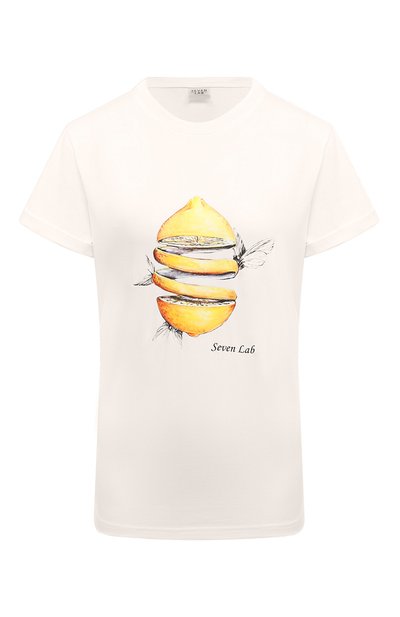 Для изготовления белой футболки с круглым вырезом использовали мягкое хлопковое джерси. Оно хорошо пропускает воздух и поддерживает комфортный микроклимат. Спереди модель украсили крупным принтом в виде лимона и бабочек, дополнив узор логотипом марки.