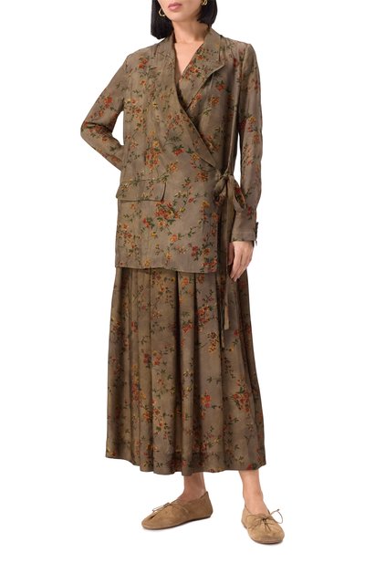 Эта юбка оттенка хаки добавит образу женственность и романтичность. Нужный тон модели задают расклешенный крой и крупный цветочный принт. Для пошива изделия с узким поясом использовали тонкий дышащий хлопок с плотным переплетением шелковистых нитей, которое делает ткань прочной и практически немнущийся.