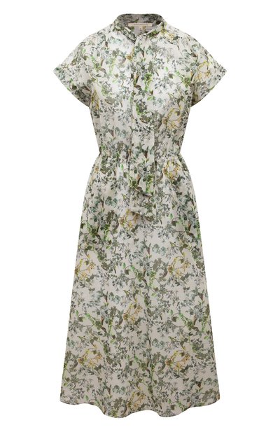 Нежный цветочный принт делает это зеленое приталенное платье особенно женственным. Романтичности модели с эластичной вставкой на поясе добавил воротник аскот с длинными лентами, которые можно завязать на бант или как галстук. Изделие с отворотами на коротких цельнокроеных рукавах сшили из ультратонкой хлопковой вуали, поэтому оно почти не ощущается на теле.