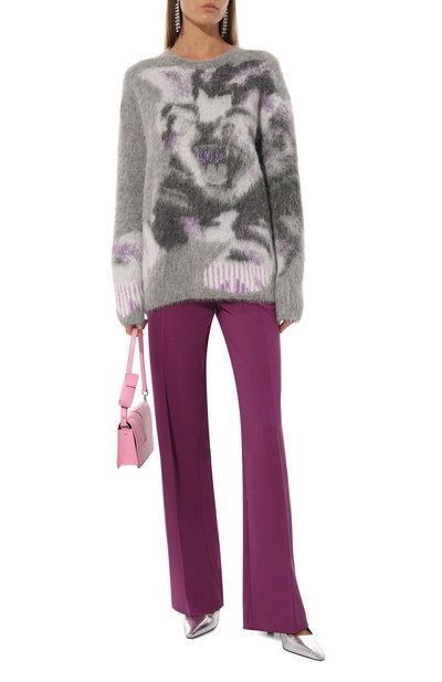 Брюки приглушенного розового оттенка выполнили из тонкого атласа, который создает игру света и тени, делая цвет изделия более выразительным. Модель со стрелками и четырьмя карманами дополнили спереди защипами, сформировав небольшие складки. В комплекте – пояс с двумя D-образными кольцами.