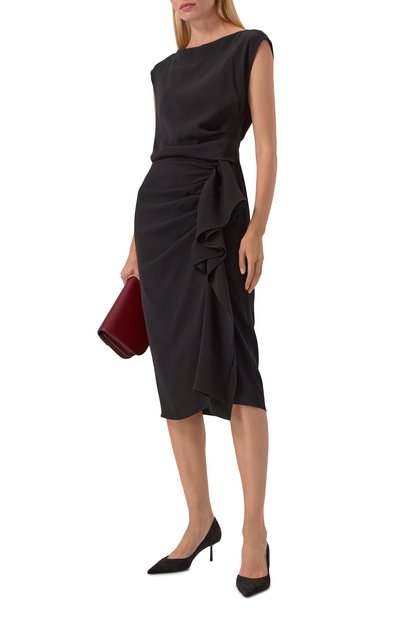 Для пошива черного платья Александр Терехов выбрал тонкое эластичное джерси, поэтому оно садится точно по фигуре, не сковывает шаг и не мн ется. Модель макси с боковым разрезом на подоле, открывающем ногу в движении, дополнили спереди и сзади кулисками: продетый в них тонкий шнур играет роль бретелей и завязывается бантом на спинке.