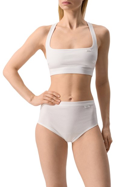Белые базовые слипы из коллекции Mellow Bliss дополнили ажурной вставкой на поясе, украшенной фактурным меандровым узором. Для пошива модели использовали плотный трикотаж из лиоцелла и хлопка, сертифицированного GOTS. Трусы из этого дышащего материала с д