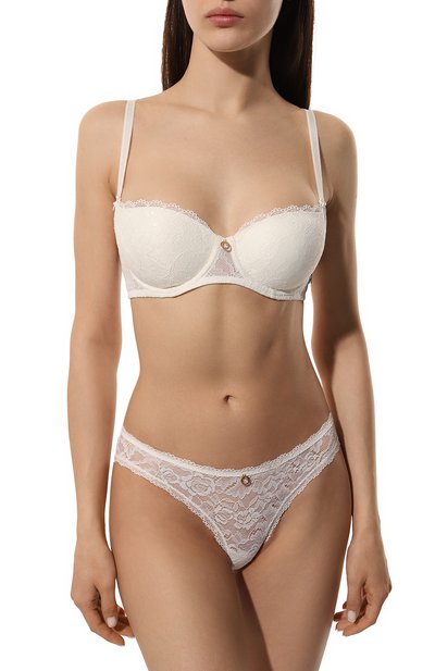 Бюстгальтер из линии Kiss Of Love с плотными чашками на косточках сшит из ажурного кружева. Модель со съемными бретелями и эластичным поясом украшена золотистой подвеской спереди.