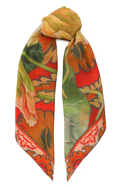 Шелковый платок из коллекции «Природа Евразии» украсили красочным принтом в виде настурции и обвели кантом с орнаментальным мотивом. Края квадратного аксессуара подшили вручную.