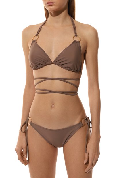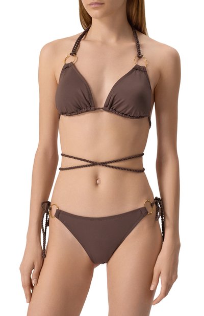 Оранжевый раздельный купальник выполнили из легкого эластичного материала, который быстро сохнет и долго не теряет яркость цвета. Бра с треугольными чашечками дополнили удлиненными завязками, которые выполняют не только функциональную, но и декоративную роль: их можно несколько раз обернуть вокруг талии, подчеркнув ее. Посадку плавок удобно регулировать шнурками по бокам.