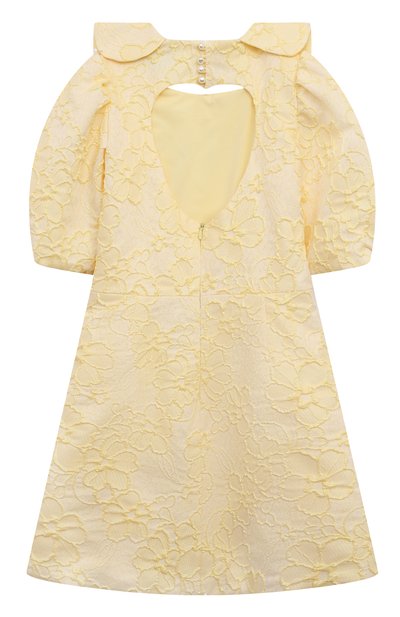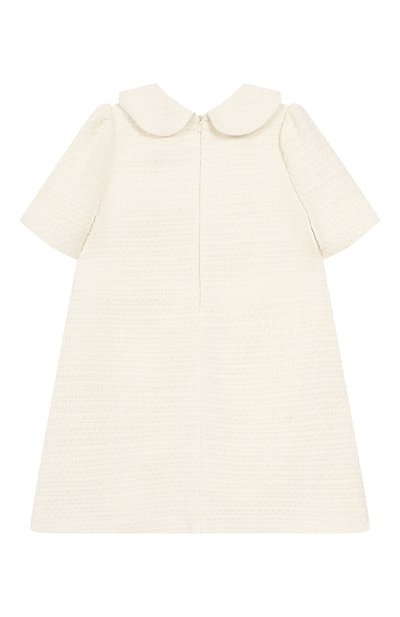 Кремовое платье А-силуэта делает особенно элегантным благородная фактура мягкого хлопкового твида. Романтичность модели придают воротник «Питер Пэн» с фестончатым краем и объемные банты на рукавах-фонариках, края которых подчеркнули каймой из золотистой цепочки с круглыми звеньями. Модель застегивается потайной молнией сзади.