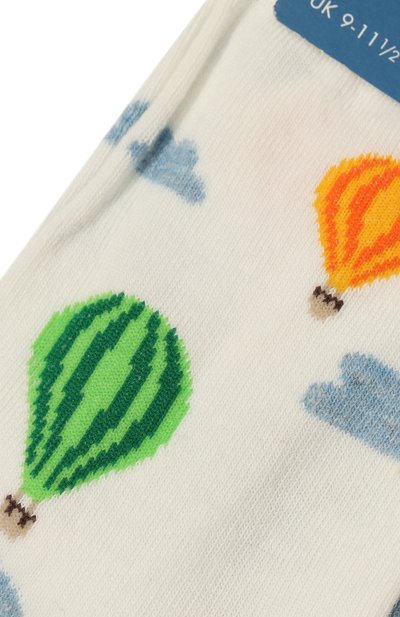 Короткие белоснежные носки с разноцветным жаккардовым мотивом в виде мячей выполнили из мягкого эластичного трикотажа. Для производства пряжи использовали органический хлопок и прочный полиэстер, поэтому изделие комфортно облегает ногу, приятно ощущается на коже и поддерживает оптимальный микроклимат. Узкую манжету п одчеркнули ярко-зеленой полоской.
