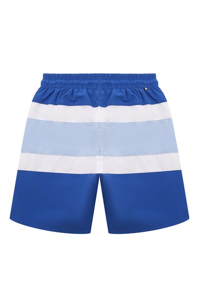 Свободные плавки-шорты сложили по принципу color block из контрастных отрезов шелковистого полиэстера, сформировав фирменный бело-коричнево-черный триколор. Сзади у широкого эластичного пояса-кулиски расположили миниатюрный вшивной патч таких же оттенко в. Принадлежность марке подчеркнули и принтом-логотипом под левым прорезным карманом.