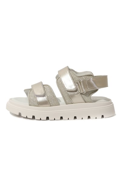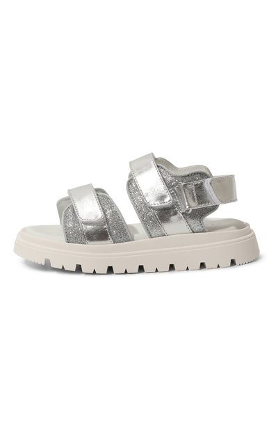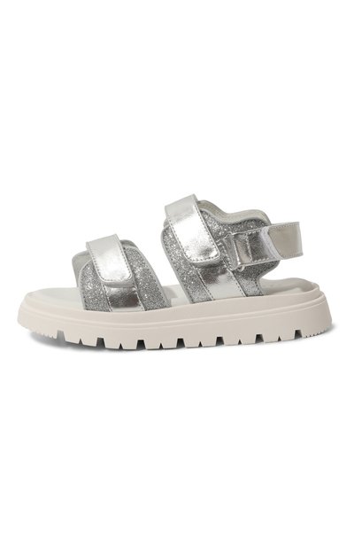 Для производства серебристых сандалий использовали глянцевый материал, напоминающий гладкую металлизированную кожу с тиснением из логотипа бренда. Мотив поддерживает черная надпись на одном из трех ремешков велкро. Модель дополнили анатомической стелькой и широкой подошвой.