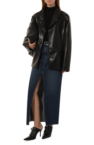 Синяя юбка из плотного денима выглядит так, словно ее повернули на талии на 90 градусов. Такое впечатление создают асимметричные карманы, а усиливают иллюзию застежка и высокий разрез, смещенные вбок. О принадлежности марке говорит ярко-красный патч с фирменный эмблемой, расположенный на широком поясе.